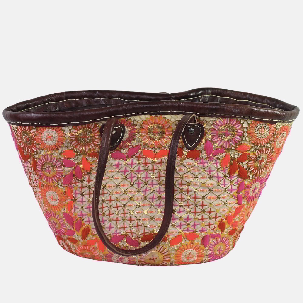 Bonita cesta marroquí de mimbre tejido, 100% hecha a mano en Marrakech, decorada con magníficos bordados en colores de frutos rojos. Asas de piel que garantizan comodidad al hombro.