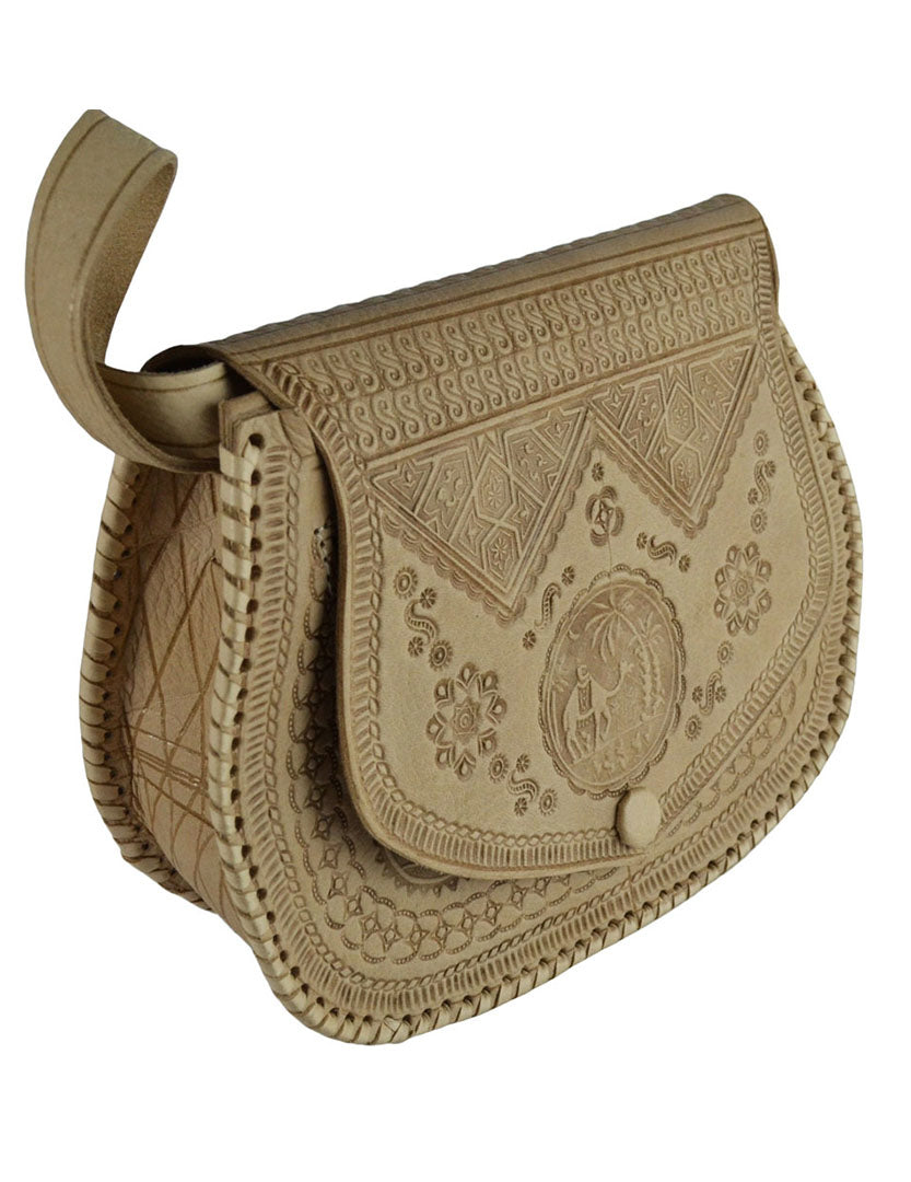 Este bolso de piel, un auténtico ejemplo de la artesanía marroquí, está elaborado a mano con piel auténtica. En un rico color camel y con un diseño floral en relieve, es elegante y práctico. Su tamaño mediano y su bandolera ajustable lo convierten en un complemento ideal para todas las ocasiones.