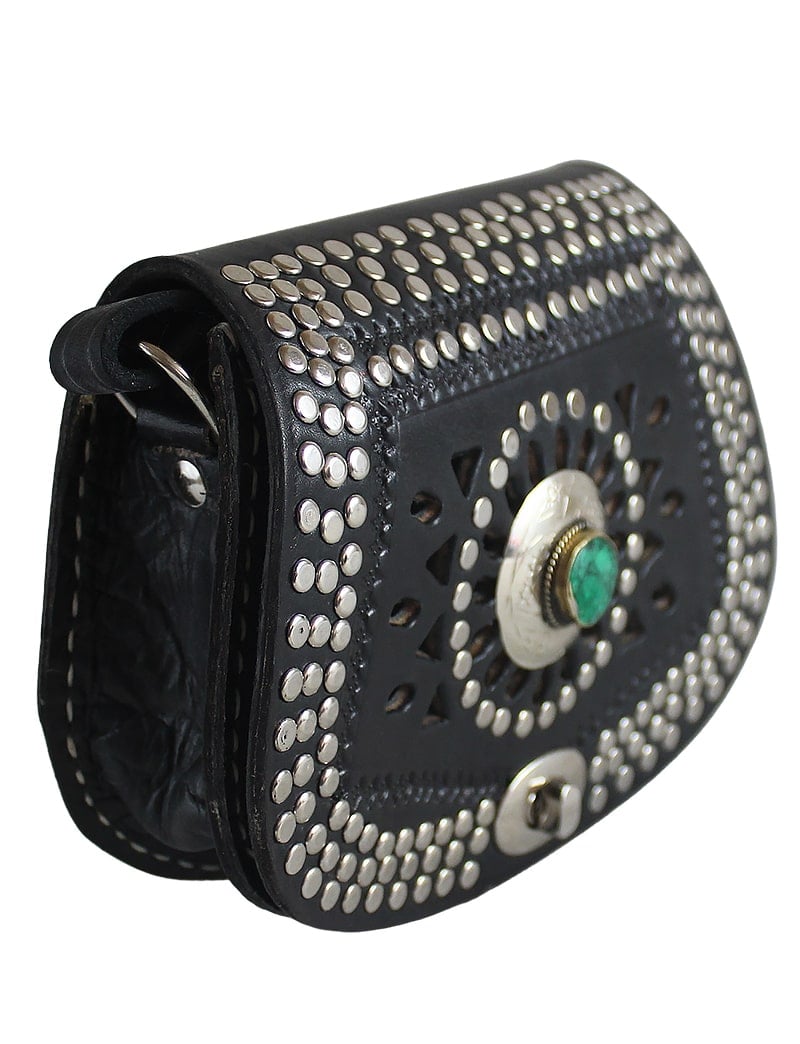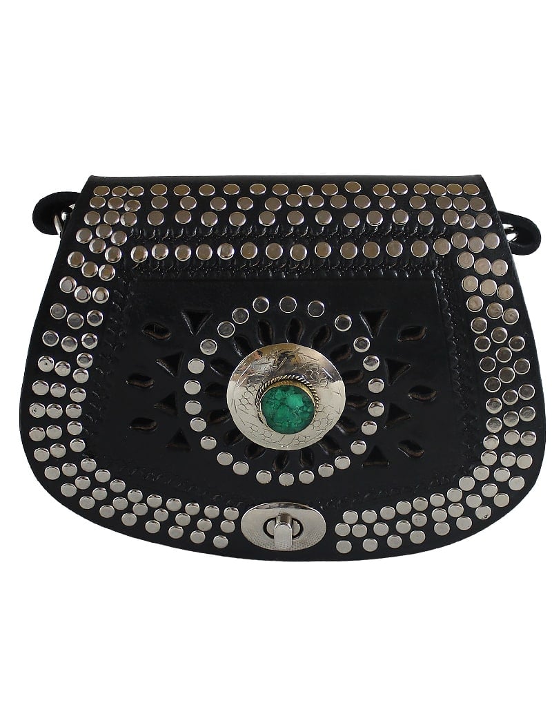 Este bolso de cuero genuino negro fue hecho a mano en Marruecos por talentosos artesanos. Está realzado con tachuelas plateadas y una piedra verde para darle un toque de originalidad y elegancia. Perfecto para una noche de fiesta en la ciudad o un día en la oficina, este bolso seguramente llamará la atención.