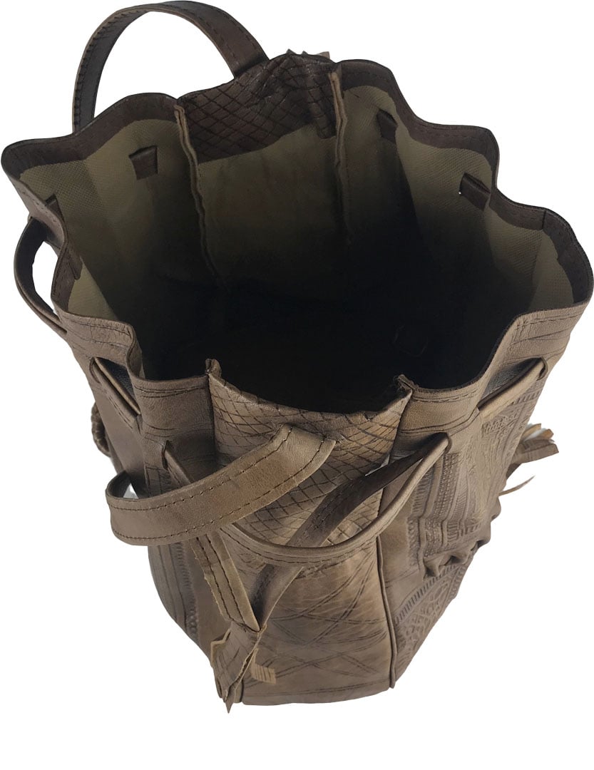 El bolso es de color marrón y presenta patrones geométricos tradicionales grabados en el cuero. También cuenta con una correa para el hombro ajustable y un bolsillo exterior.