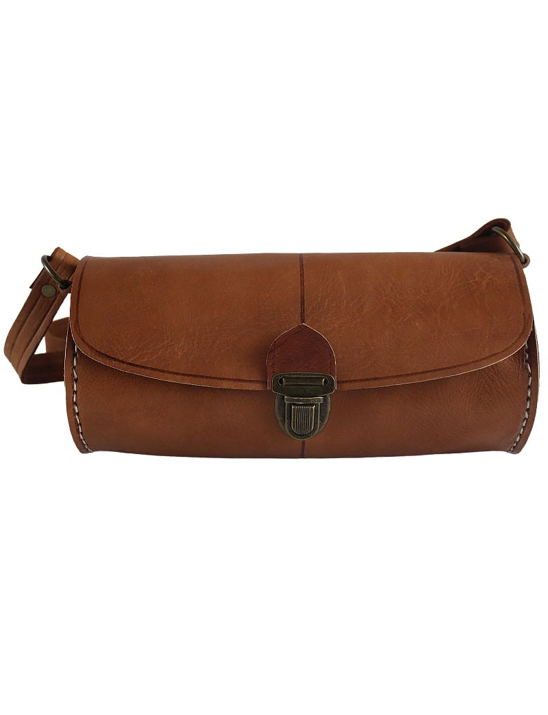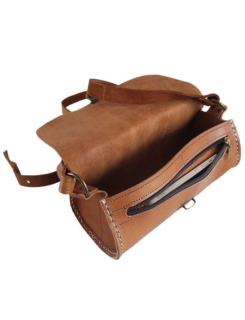 Añade un toque de elegancia y originalidad a tu estilo con este bolso artesanal marroquí de piel en forma de cilindro.